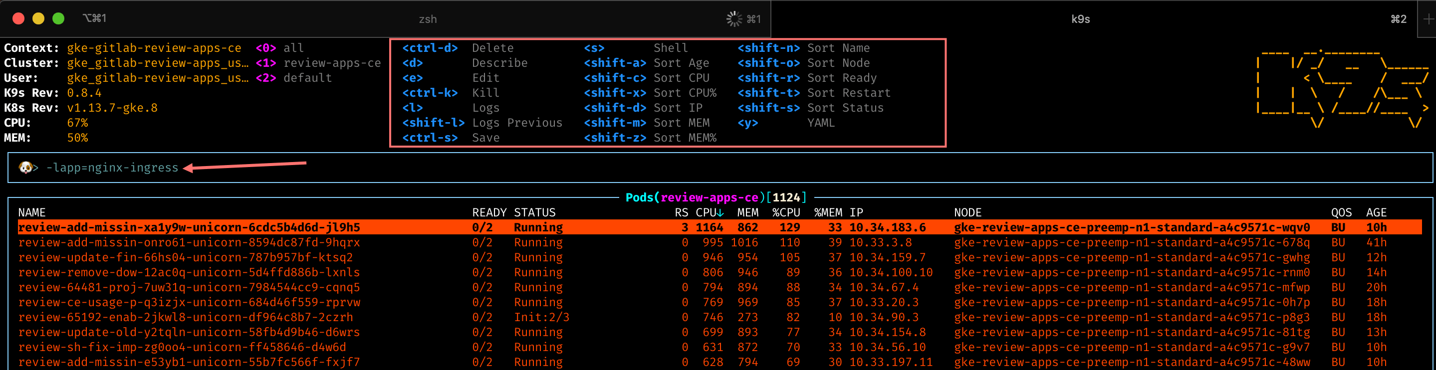 K9s is a powerful command line dashboard which allows you to filter by labels. This can help identify trends with apps exceeding the review-app resource requests. Kubernetes schedules pods to nodes based on resource requests and allow for CPU usage up to the limits.