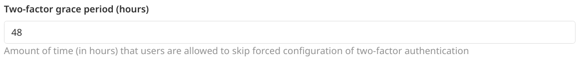After the two-factor authentication is configured as mandatory, users are allowed to skip forced configuration of two-factor authentication for the configurable grace period in hours.