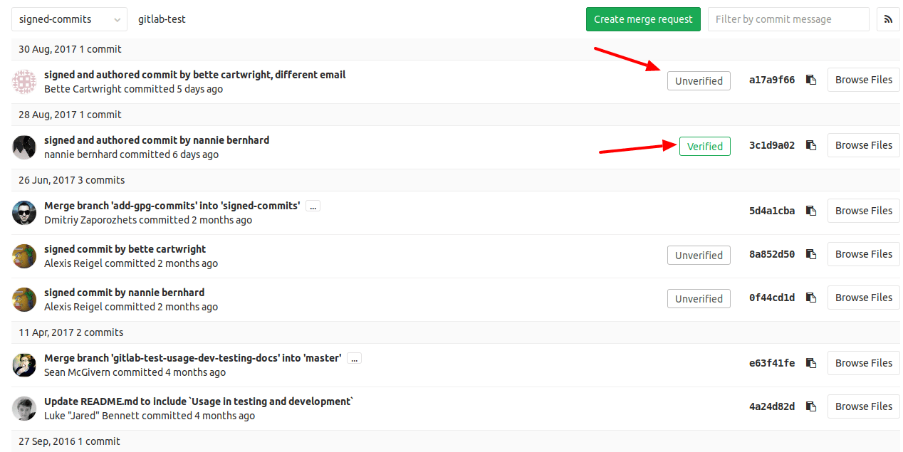 Within a project or merge request, navigate to the Commits tab. Signed commits show a badge containing either Verified or Unverified, depending on the verification status of the GPG signature.